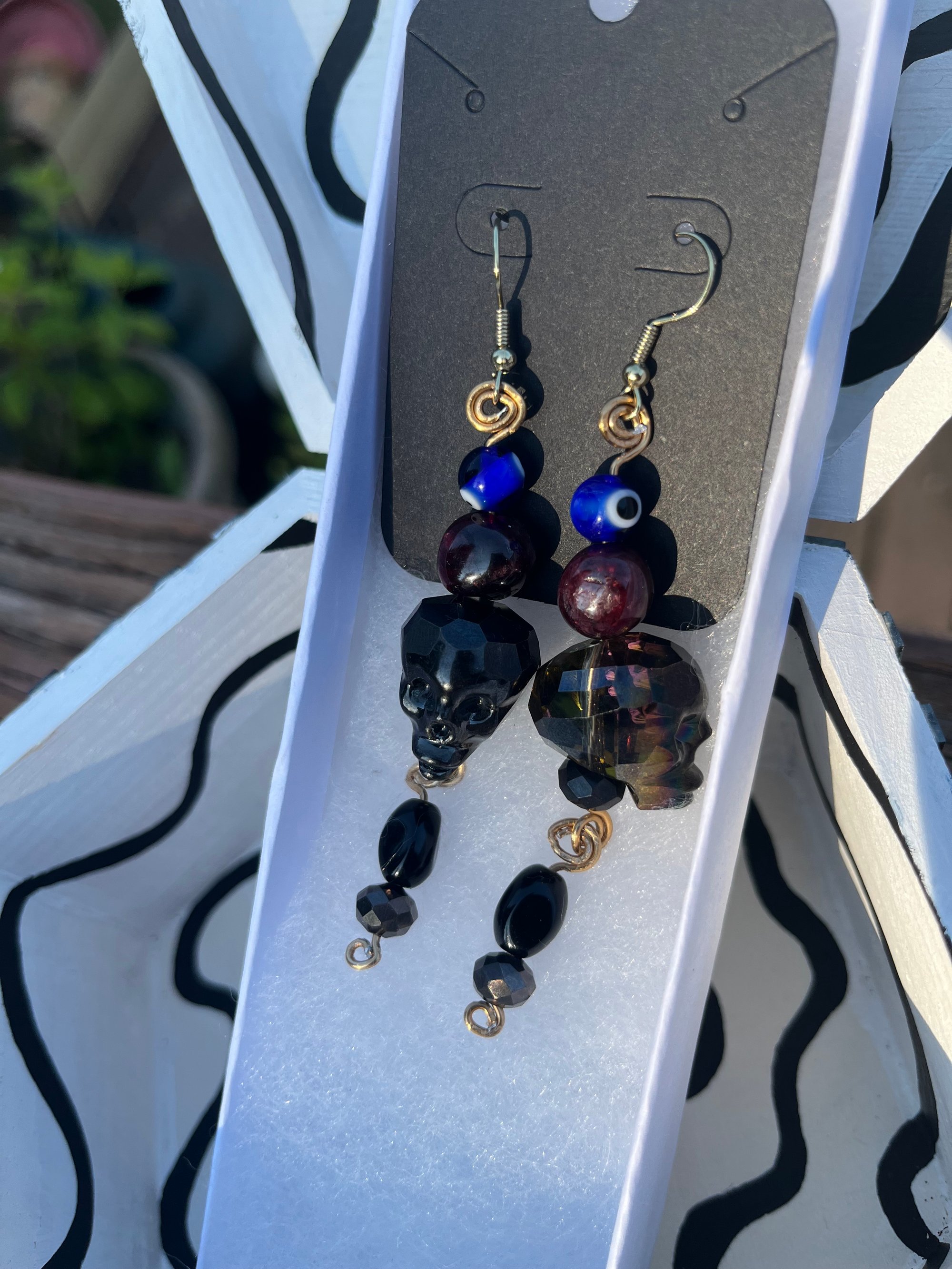 Goth Mami earrings dangle from your ears with a protective blue nazar, deep red garnet and a black sun catching skull