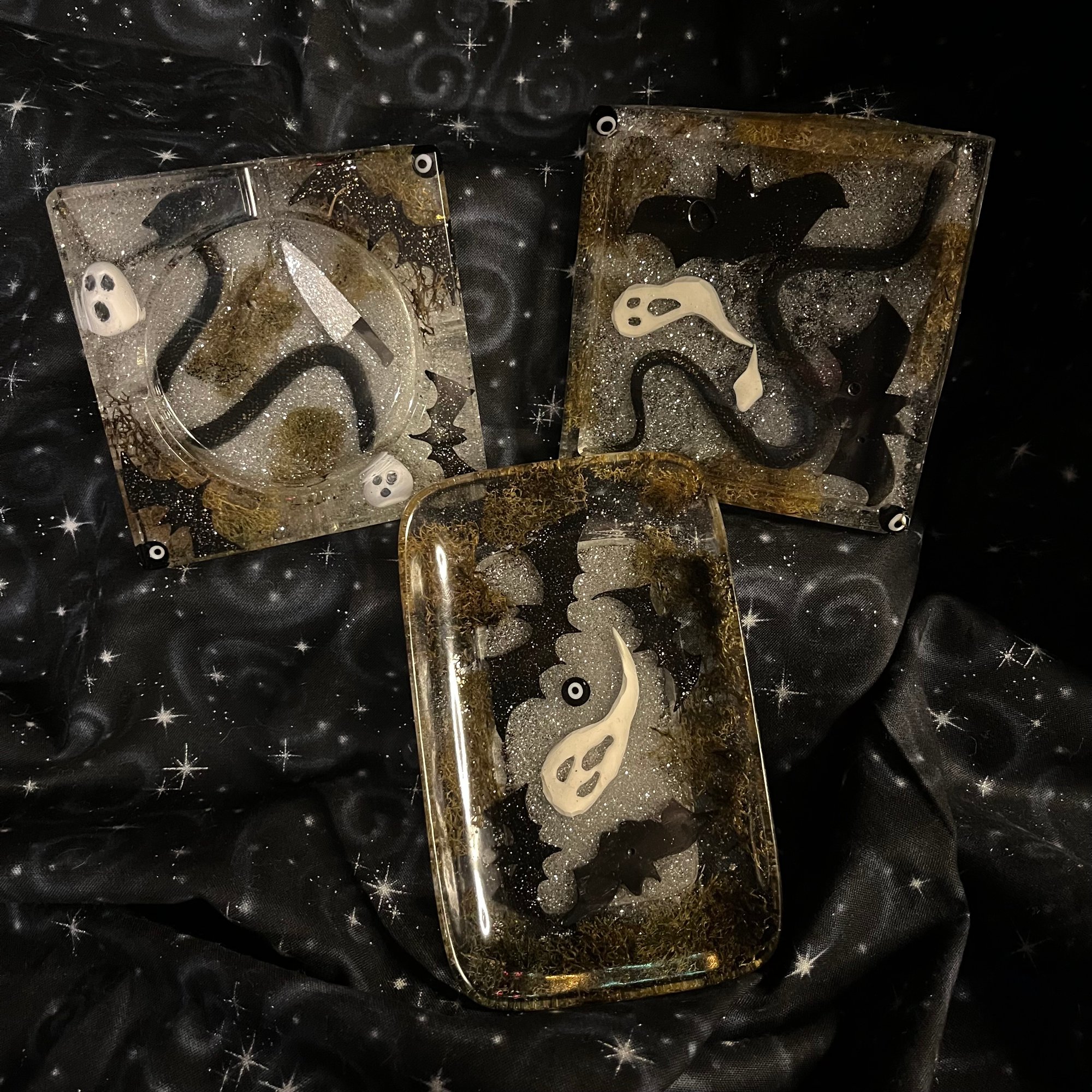 Hand sculpted polymer clay knives, bats and ghosts, by yours truly. Snakes slithering around a glittery moss bottom with black nazars to help ward off the evil eye and negative energies.
