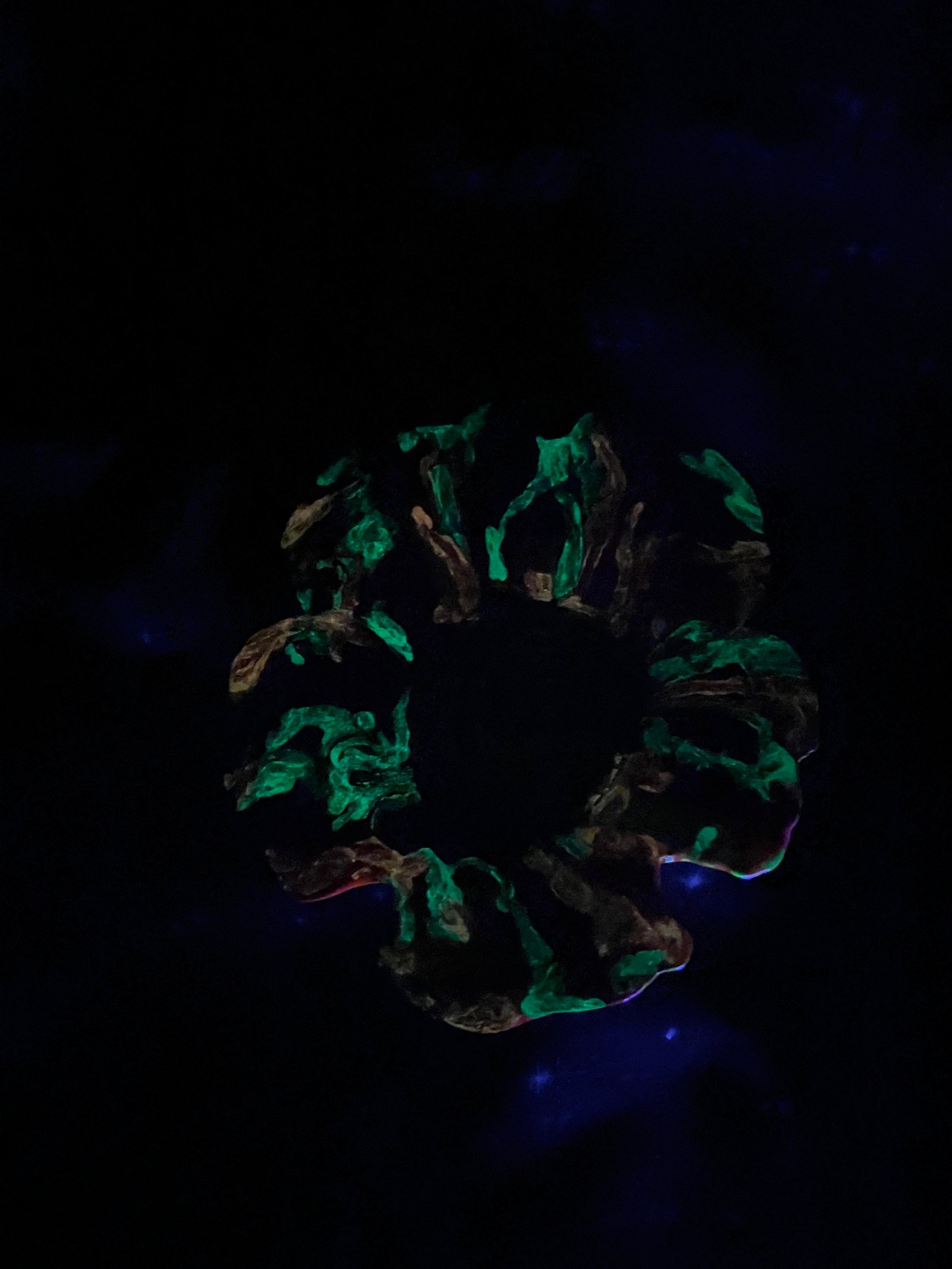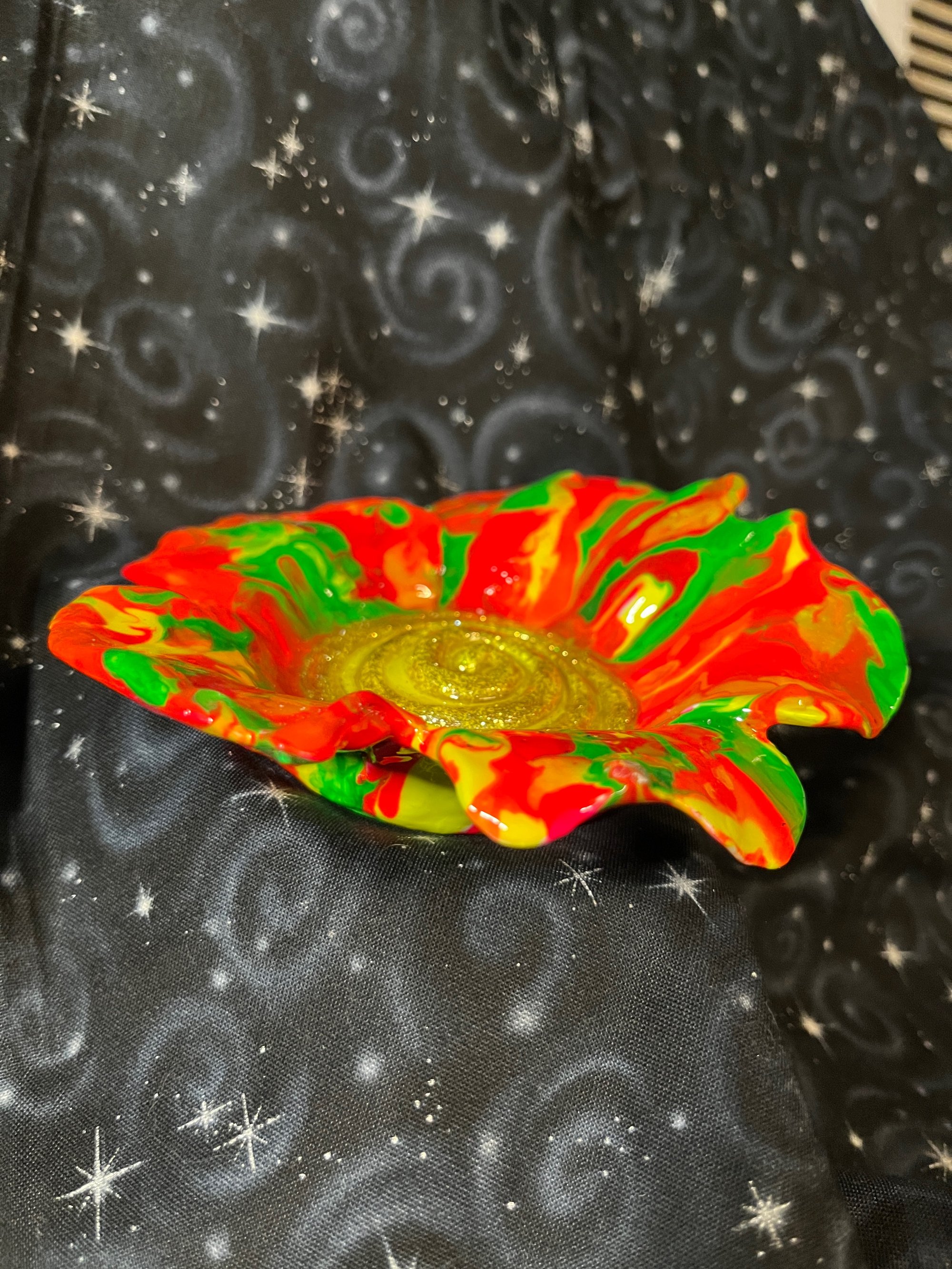 1 of 1 hand sculpted, polymer clay ashtray, UV reactive and glow-in-the-dark details, glittered, painted and encased in a layer of resin